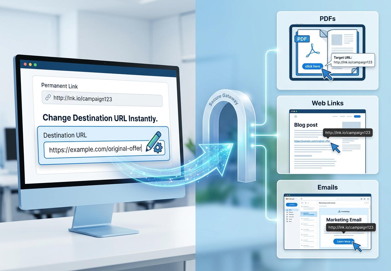 Our system introduces a groundbreaking approach by creating a single “Permanent Link” that acts as a secure gateway. This innovative solution allows you to change the Destination URL behind the scenes at any given moment. This means you can update links in seconds—without touching creative assets or restarting tedious approval cycles. This dynamic gateway is perfect for various applications, including:
