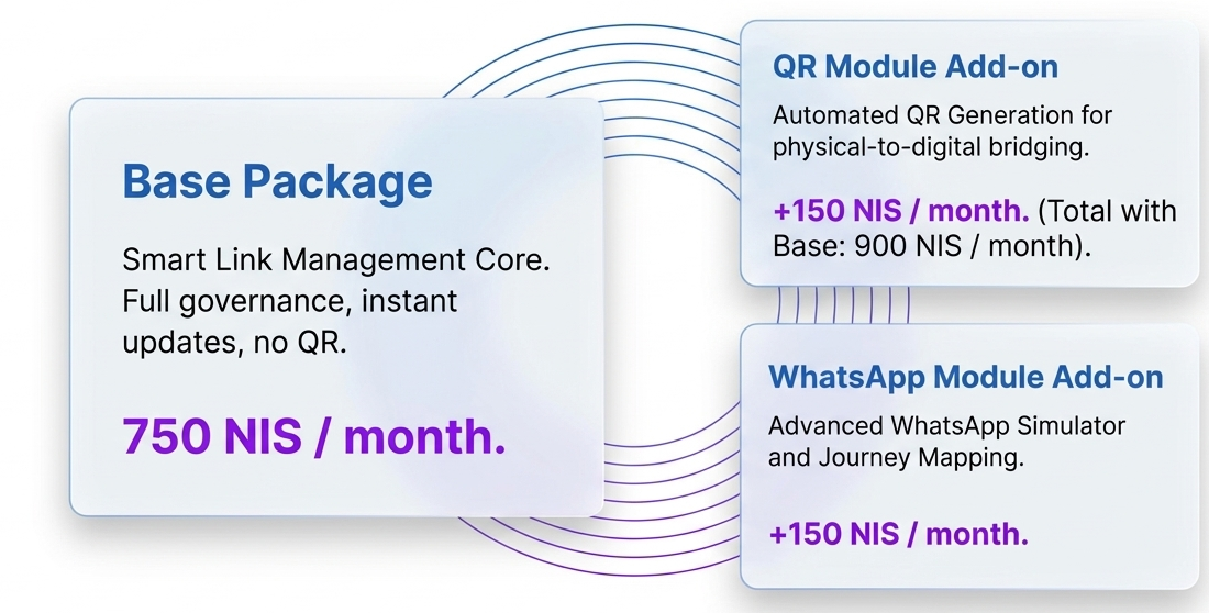 - Base Package: Smart Link Management Core. Full governance, instant updates, no QR. 750 NIS / month.